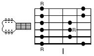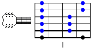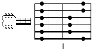 Notice that it starts on the last of the 3 little shapes. The first two are "off the neck" as it were. So although at first glance it might seem as though the pattern has changed, in fact it hasn't. Its just that in this position, we're starting somewhere in the middle of the inner pattern. Because we've played the last of the little shapes, we naturally should go on to the 2 big shapes, and as you can see from the diagram above, that's exactly what happens. Once we've completed the pattern by playing the 2 big shapes, we continue by starting the pattern again with the 3 little shapes - as you can see in this case, on the top three strings. OK, now hopefully you understand and can see the inner pattern in any of the five pentatonic box shapes. If you're not sure, study the five pentatonic box shapes (click here if you need to see them) and the inner pattern - 3 little, 2 big - until you can easily identify where you are in the inner pattern in any of the five box shapes. Now its time to see why this inner pattern is so useful. Look at the diagram of the minor pentatonic, box shape one below: