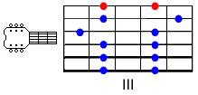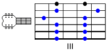 Notice that there are 3 "little shapes" followed by 2 "big shapes". This sequence, 3 little, 2 big; is the key to unlocking the neck. Let's see why. Look at the following diagram of the third box shape of the pentatonic scale. If you are unfamiliar with the five pentatonic box shapes here's another chance to click here for a full set of diagrams.